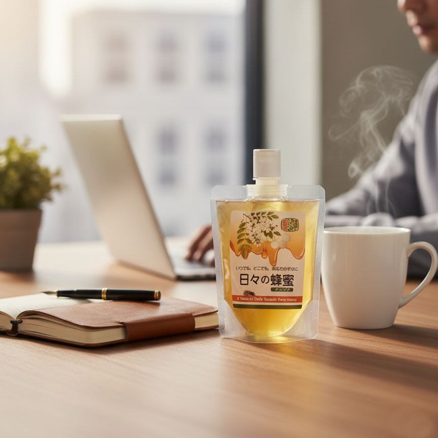『日々の蜂蜜』は、独自の注ぎ口を持つパウチ容器を採用することで、これらの不満をすべて解決します。